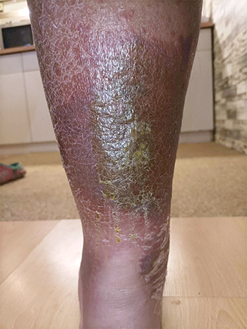 - koža vysychá, praská a môže z nej vytekať žltkasto sfarbený výtok (lymfa)