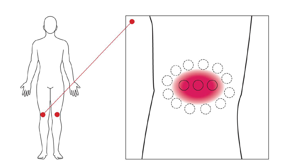 Schéma znázorňuje možný spôsob ošetrenia. Červená oblasť označuje bolestivú, zapálenú plochu; malé kruhy sú body ošetrenia.