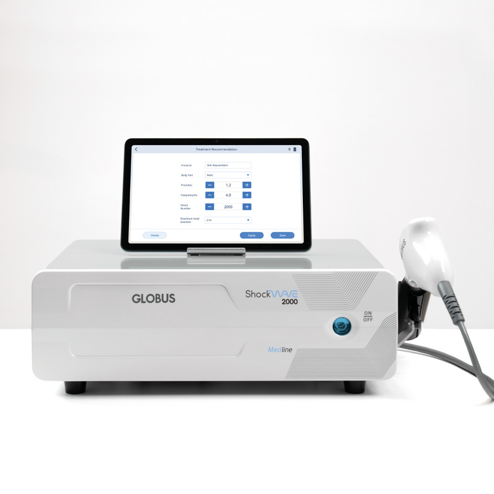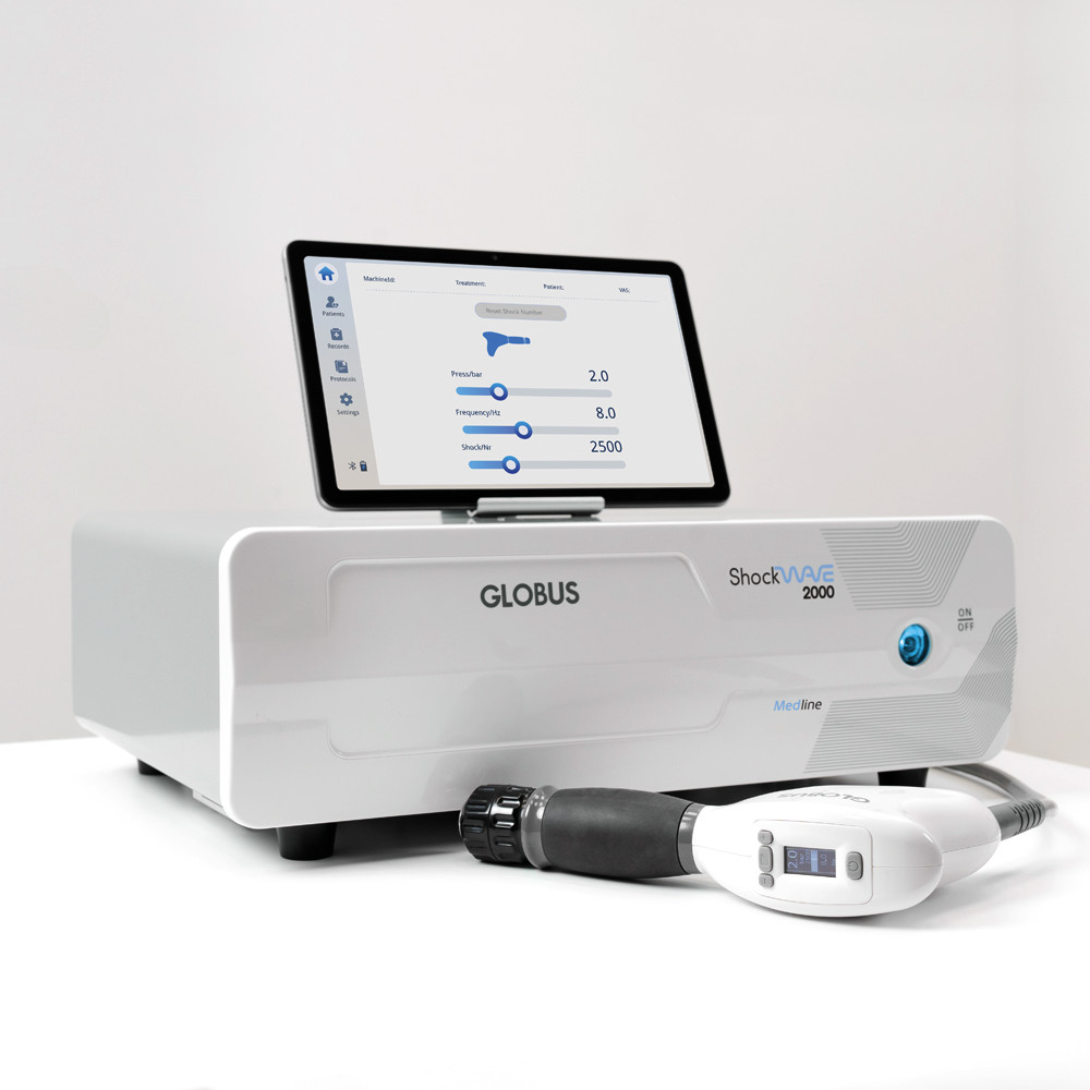 ShockWAVE 2000 Med Line je lekársky prístroj na radiálnu šokovú terapiu od Globus: silnými akustickými impulzmi aktivuje prirodzené regeneračné procesy v organizme, špeciálne určený na liečbu myofasciálnych a pohybových bolestivých syndrómov. Systém disponuje dotykovým displejom na tablete, integrovaným LCD displejom na rukoväti a reálnom časovom tlakovom indikátorom, čo zabezpečuje rýchle a jednoznačné nastavenie a kontrolu pri bežnej lekárskej praxi.